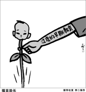 教育专家认为,国内早教市场良莠不齐,鱼龙混杂,家长们过于重视早教,而忽视甚至违背儿童成长规律,用灌输的方法、过度的教育来拔苗助长,反而事与愿违,让孩子丧失了幸福的童年。 新华社发