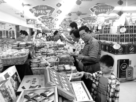 昨日,在市区七一路一家超市里,购买月饼的市民络绎不绝。中秋节临近,我市各大超市精心准备了各种月饼,摆在显要位置供市民选购。记者 王映 摄