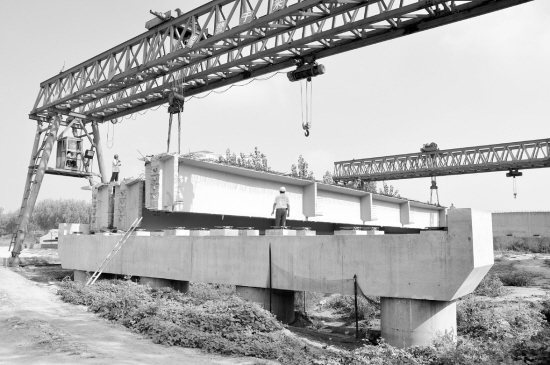 正在建设中的沈丘东环路沙河大桥进入架梁阶段。东环路沙河大桥位于沙颍河沈丘县东城办事处尤庄段,大桥设计跨度260米、宽度20米,总投资2000多万元。大桥建成后对拉大县城框架、缓解城区交通压力、拓展县城发展空间、加快沈丘对外开放步伐、推动沈丘经济社会跨越发展具有重要的现实意义和深远的历史意义。 (韦伟 迟驰 摄)