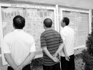 项城市李寨镇镇村干部正驻足在阅报栏前阅读《周口日报》,及时了解各县市是如何开展一事一议筹资筹劳工作的。薛全伟 摄