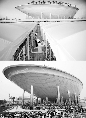 上海世博会沙特馆前正在安装的排队长廊(9月5日摄)(上图)。世博会沙特馆排队参观的队伍(2010年5月5日摄)(下图)。