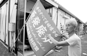 在日本宫城县女川第一小学校园内的临时安置房,年过八旬的阿部宗锐在房前打出一面反对女川核电站的旗帜。女川核电站震后停运至今。(9月8日摄) 新华社记者 冯武勇 摄