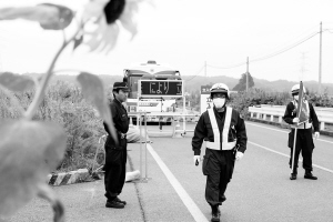 9月11日,在日本南相马市,日本警察在福岛核事故20公里警戒区的一处入口检查站执勤。目前,以福岛第一核电站为中心的20公里警戒区尚未解除,警戒区内的原居民仍在外避难。