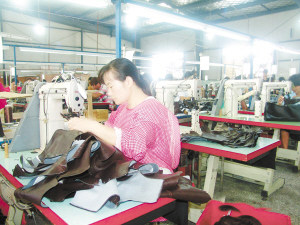 西华县凯鸿鞋业目前正在加紧生产5个型号10多种产品的皮靴,产品全部出口美国。图为该公司工人正在紧张工作。