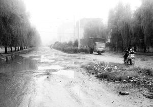 ②行走在银珠大道上的市民和车辆小心翼翼地绕行。连续几天的小雨使本来就坑洼不平的银珠大道变成了积水地,给附近居民带来了极大不便。