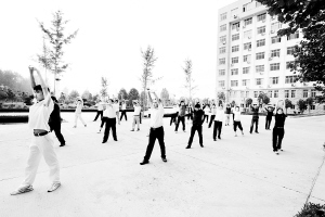 西华县人民政府办公室注重工作人员素质建设,强化理论学习,注重文娱体育活动,不断提升全体工作人员素质,工作效率得到大幅提高。图为该县政府办全体工作人员在做健身操的情形。 ( 金国明 摄)