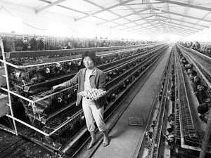图一:曹河乡栗集村养殖户正从鸡笼里拾鸡蛋。
