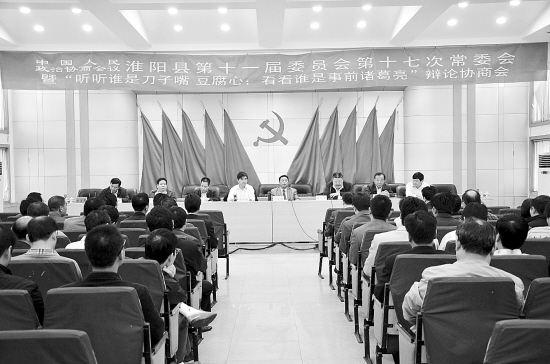 9月15日上午,在淮阳县政协十一届十七次常委会上,县政协委员代表,龙湖游船船主代表,龙湖管理处有关人员,交通、环保部门负责人等10余人围绕“如何加强龙湖管理”这一命题纷纷建言献策。记者了解到,淮阳县政协将好的建议归纳总结成建议案,递交县委、县政府,供决策参考。(记者 侯俊豫 摄)