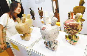 9月15日,观众在展会上参观用废纸制成的卡通储钱罐。 当日,2011上海设计展开幕。来自中国、德国、奥地利、日本等10多个国家和地区的设计师在本届展会上集中展示了建筑、环境装置、公共艺术、平面、时装等多个领域的设计作品。(新华社发)