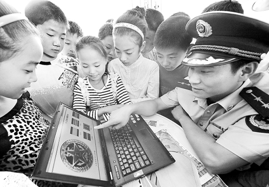 9月15日,边防民警赵云鹏(右)在给小学生讲解国防知识。当日,河北省滦南县柳赞二村小学邀请驻地边防民警来到学校,开展“爱祖国、筑长城”国防教育活动,活动中民警利用国防知识图片,向小学生们详细讲解我国现代国防建设。9月17日是我国第十一个全民国防教育宣传日。 (杨世尧 摄)