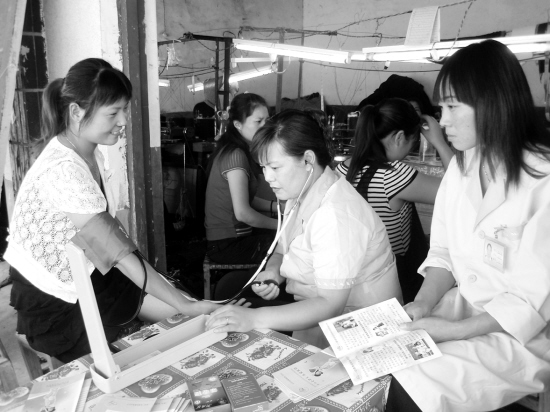 9月20日,巴村镇计生技术服务人员在毛衣编织厂为育龄妇女进行健康检查。近日,该镇计生办针对育龄妇女在家门口就业多的实际,积极组织计生技术服务人员深入民营企业,为育龄妇女进行生殖健康检查和妇科病普查服务活动,并发放宣传资料、避孕药具,受到广大育龄妇女的欢迎。(记者 岳建辉 通讯员 乔连军 摄)