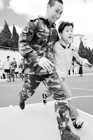 9月27日,福建省福清市公安边防战士和特教学校的学生一起玩“捆绑过关”游戏。