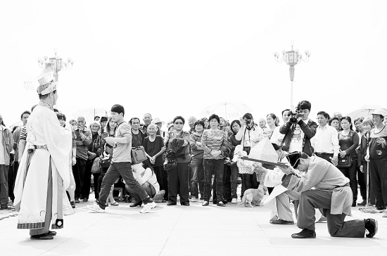 近日,游客在观看太昊陵祭祀表演。每逢节假日或双休日,太昊陵景区都会有祭祀表演。这对丰富太昊陵旅游内容、提高游客到太昊陵旅游兴趣、宣传太昊陵文化内涵都有积极作用。(记者 侯俊豫 通讯员 闫俊岭 摄)