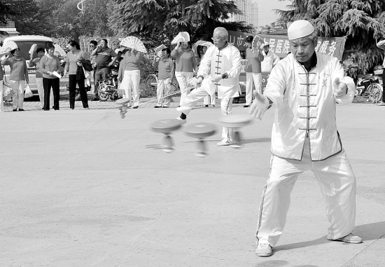 近日,在滨河广场,川汇区委老干部局组织区空竹协会的老人举行庆重阳抖空竹比赛。老人们在自娱自乐的同时,也让广大市民大开眼界。图为老人们在表演花样空竹。樊葩菡 卢文涛 苑昆鹏 摄