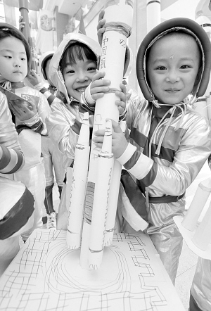 9月29日,天津青少年活动中心的小学员在展示自制航天器模型。当日,由天津青少年活动中心的小学员们与老师共同布置的“迷你航天科技园”完成,孩子们在老师的帮助下按照比例制作“天宫一号”、长征火箭等航天器,感受航天魅力。