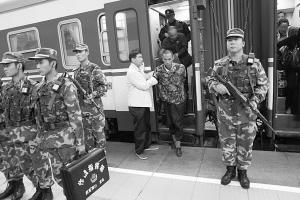 随后,18名逃犯手戴手铐,在武警、特警的押解下开始陆续登车,旁边经过的旅客无不投来惊诧的眼光。19时14分, T198次列车缓缓驶出站台。