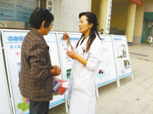 10月8日是第14个全国高血压日,为进一步提高广大群众对高血压病的认识,增强自我保护、早期预防的意识,周口市疾病预防控制中心在周口市专科病医院门前以悬挂横幅、散发宣传材料、咨询答疑等形式进行高血压防治知识宣传。图为工作人员向市民讲解预防高血压知识。