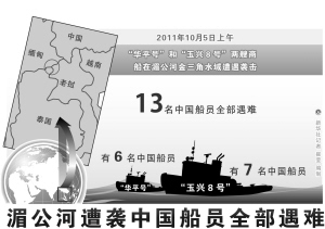 外交部发言人刘为民10日在例行记者会上确认,10月5日,“华平号”和“玉兴8号”两艘货船在湄公河水域遭不明身份武装人员劫持和袭击。截至目前,已有11名中国船员遇难,两名失踪船员搜寻工作仍在进行之中。