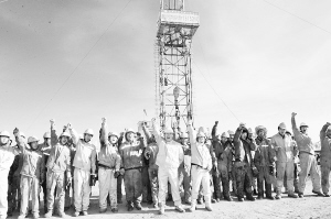 10月11日,15152钻井队工人庆祝连续三年年进尺10万米。当日,大庆钻探工程公司15152钻井队实现年进尺10万米目标。这是这支有“新时期钢铁钻井队”之称的队伍连续第三年实现这一目标,并再次刷新大庆油田纪录。新华社发