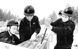 近日,郸城县电业局职工对淮郸110kv线路施工,以确保该县的正常供电。(刘兴刚 摄)