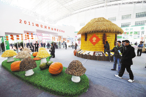 10月13日,一些市民在参观农博会展厅。当日,2011哈尔滨农业博览交易会在哈尔滨国际会展体育中心举行。此次农博会展出面积28000平方米,参展企业816家,集中展出了国内外上千种特色农业产品。 (新华社记者 王松摄)