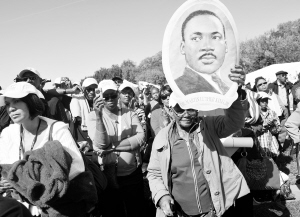 华盛顿上万人纪念马丁·路德·金 10月16日,在美国首都华盛顿,一名妇女举着马丁·路德·金的画像参加集会。当天,包括美国总统奥巴马一家在内的上万人在华盛顿集会,为马丁·路德·金纪念园举行正式揭幕仪式。 新华社记者 张军 摄