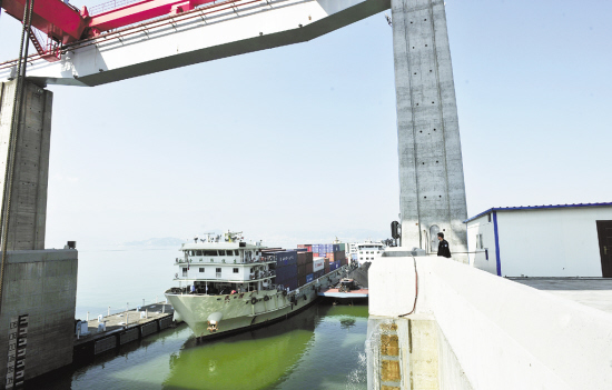 10月17日,货轮通过三峡五组船闸南五闸室下行。当日11时,三峡水库水位升至173.65米,三峡水库呈高水位运行。为保障船舶和桥梁安全,海事部门对航行于三峡库区的船舶采取限高措施。(新华社发)