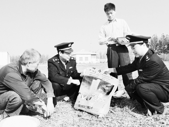 扶沟县工商局工作人员深入田间地头,向农民宣传农资打假识假知识,并就当前农资市场中存在的宣传不实、以次充好、标签和使用说明不规范、售后服务不到位等违法违规情况进行现场讲解,以提高农民识别假冒伪劣农资的能力。图为该局工作人员正在向农民讲解农资识假知识。 (卢付昌 李紫明 摄)