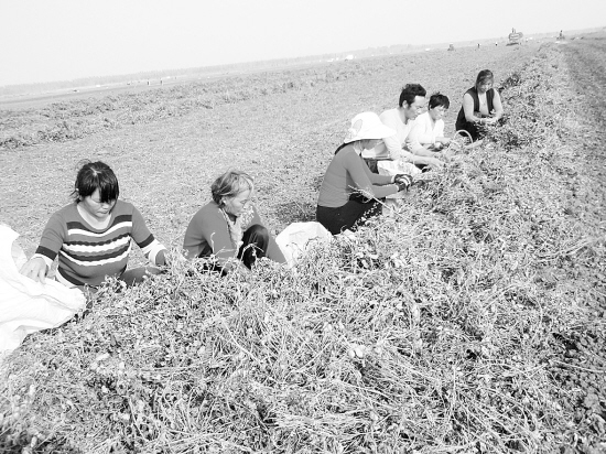 10月18日,商水县舒庄乡大朱庄村村民朱银中在与本村育龄妇女一起摘花生。今年,该乡举办了花生科学种植技术培训班,并由政府免费向群众提供花生种、化肥、农药,全乡种植无公害花生7000多亩,预计亩均花生收入达到1400多元。(记者 岳建辉 通讯员 乔连军 摄)