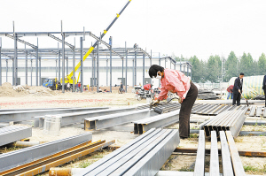 河南丰泽园年产8.5万吨食品项目建成投产后,年产值可达4亿元,年出口创汇5000万美元。图为工人在项目建设工地建设厂房。
