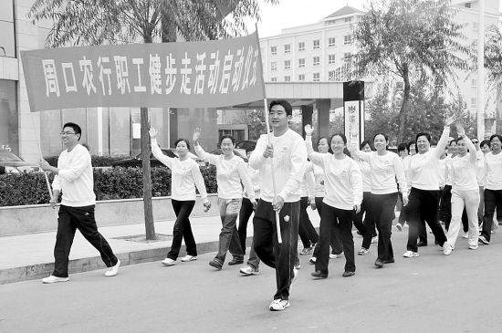 昨日上午,市农行职工近百人统一着装、英姿飒爽、健步如飞地行走在滨河路上,引起市民们侧目关注。该活动是市农行发起的以“我爱农行 我爱健身”为主题的秋季健步走活动,旨在丰富机关员工业余文化生活,激发广大员工的工作热情。( 记者 王映摄)