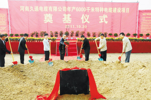 本报讯 (记者 李凤霞) 10月20日上午,河南久通电缆工程施工现场彩旗猎猎、人潮涌动、礼炮齐鸣,河南久通电缆年产6000千米特种电缆项目等6个新建、扩建工业项目集中开工奠基仪式在川汇区产业集聚区隆重举行。这标志着川汇区产业结构调整和产业升级迈上一个新台阶。市委书记毛超峰下达开工令。