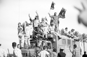 在卡扎菲的家乡苏尔特,全副武装的执政当局士兵们集结在坦克、军车和火炮周围,以对天鸣枪、互相拥抱和挥舞武器的方式庆祝战争的结束。许多人冲着电视镜头打出表示胜利的V字手势。