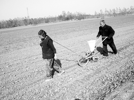 图为商水县舒庄乡片一张村的农民正在对缺苗断垄进行补种。近两天来,该乡党委、乡政府积极组织群众趁墒补种,确保小麦苗齐苗壮。 (乔连军 摄)