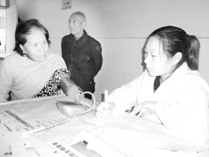 商水县郝岗乡卫生院医生正忙着为老人测量血压。该乡卫生院联合计生办积极为60岁以上的老人开展血压、尿糖等10多项免费健康检查,受到了老人们的欢迎。