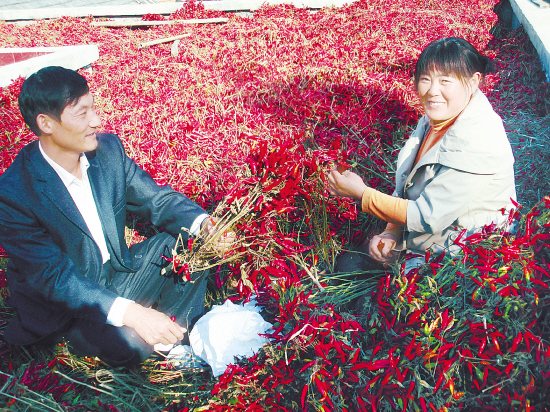 图为商水县舒庄乡椒农正在翻晒朝天椒。今年,舒庄乡扶持杜店、杨集、胡庄等几个村的群众种植800多亩朝天椒,通过科学管理,获得丰收。 (乔连军摄)