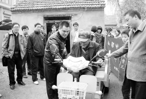 10月29日,鹿邑县文明办、总工会、共青团工作人员和爱心志愿者20多人带着价值600多元的营养品和大米、食用油等来到该县赵村乡茧王村,看望75岁的第三届全国道德模范提名奖获得者杜明祥,该县人大代表、道德公社志愿者刘贵臣也送去了价值3000多元的电动车,方便了老人家的生产生活。蒋保庆 龚耕 摄