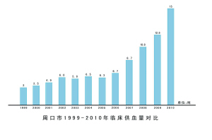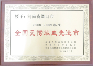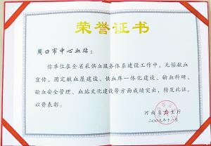 编者按:1998年10月,《中华人民共和国献血法》颁布实施,我国实行无偿献血制度,标志着我国血液管理走上法制化管理轨道。13年来,周口市已连续五届(12年)荣获“全国无偿献血先进城市”奖;原国务委员彭珮云、原卫生部长高强先后到周口市中心血站视察,对周口市的无偿献血及血液管理工作给予了高度评价;国际安全血液基金会主席杰夫瑞·布斯什曾率国际代表团来周口市中心血站考察交流。周口市的无偿献血工作得到了健康快速可持续发展,建立并完善了血液监督管理和采供血服务体系,周口市中心血站获得了“全国卫生系统先进集体”、“河南省卫生系统青年文明号”、“省级文明单位”、“河南省档案管理先进单位”、“周口市五一劳动奖状”、“周口市职业道德建设十佳单位”等荣誉。