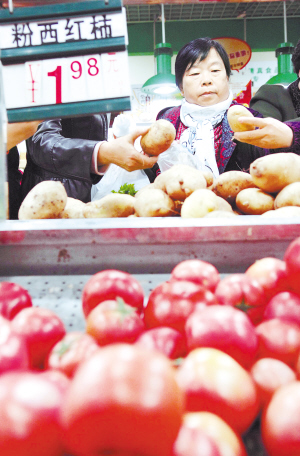 11月1日,在宁夏银川某超市内,市民在选购土豆。为平抑物价,10月24日至明年1月31日,宁夏银川实施百天蔬菜价格临时干预政策。(新华社发)