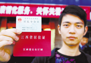 11月1日,在江西九江市庐山南路派出所,来自广东潮安的蔡小泉展示刚申领的居住证。当日起,江西省正式为流动人口办理发放居住证。(新华社发)