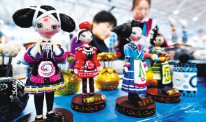 11月1日,在多彩贵州民族民间工艺品展示会上,来自贵州凯里市的一位市民在展示“树脂娃”工艺品。 (新华社发)