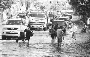 泰国洪灾死亡人数升至427人 11月2日,在泰国首都曼谷一条被淹没的街道上,行人和车辆涉水前行。泰国内政部防灾减灾厅2日通报说,持续3个多月的洪灾已造成427人死亡、两人失踪。防灾减灾厅前一天公布的死亡数据为384人。新增死亡人数中,有23人在中部大城府遇难。