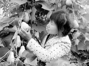10月31日,平店乡赵庄村妇女李东真正在采摘“佛手瓜”。商水县在开展“幸福家庭行动”中,积极引导广大农民利用房前屋后科学种植珍贵稀有、高产高效的优质农作物。眼下,全县广大农户种植的绿色食品“佛手瓜”已挂满枝头,成了农村一道亮丽的风景。(赵永昌 摄)