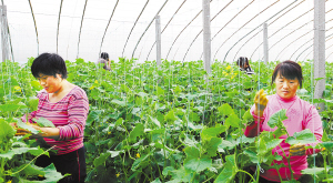 郸城县大力培育发展特色农业,围绕市场做文章,取得了明显的效果。图为该县群众在占地1100亩的南丰镇惠农无公害蔬菜基地管理黄瓜。(刘兴刚摄)