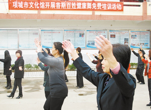 昨日,首期参加百姓健康舞免费培训的群众在项城市文化馆伴着轻快的舞曲翩翩起舞。近年来,项城市委、市政府通过积极引导、政策支持等措施大力发展文化产业。目前,该市文化产业发展呈现快速、良好态势。(赵献伟 摄)
