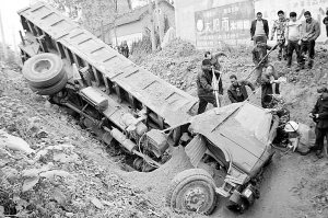 据目击者介绍,当时这辆卡车正在路上行驶,突然一声爆炸声,卡车就斜冲进了路边的深沟里。消防人员到达现场后,经观察发现,装满了沙土的卡车,侧卧在2米多深的沟里,沙土因剧烈冲击散落一地,车头已经严重变形,驾驶室车顶整体向里凹进,将被困司机紧紧挤压在驾驶座上,无法动弹,司机不时发出痛苦的呻吟,车头四周堆积着厚厚的沙土,给救援工作造成了极大不便。根据现场情况,指挥员立即组织官兵对驾驶室上侧的车门进行破拆,清理驾驶室内的沙土及其杂物,并组织周围群众对车头四周的沙土进行清理,扩大车头外围救援空间。指挥员利用吊链对车头凹进部位进行拉伸,减少对被困司机的挤压程度,同时调集大功率吊车做好起吊准备。