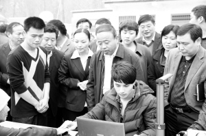 11月3日,太康县在常营镇召开城乡居民社会养老保险工作现场会。图为与会人员正在参观常营镇前河村居民社会养老保险宣传和缴费现场。(张振北 摄)