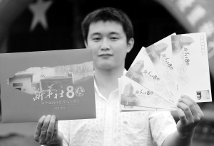 《新华社建社80周年》纪念邮票在江西瑞金首发 11月7日,瑞金市一位市民在展示《新华社建社80周年》纪念章及首日封。当日,《新华社建社80周年》纪念邮票首发仪式在江西瑞金举行。纪念邮票一套4枚,分别为《红色电波》、《抗战号角》、《解放战鼓》、《走向世界》。 新华社记者 周科 摄