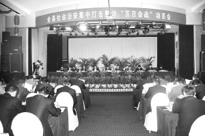 县委副书记、政法委书记梁建松部署“百日会战”整治活动的具体工作,他要求,公安部门要加强案件破获力度,坚持命案必破;加大对黑社会团伙打击力度,要通过“百日会战”整治活动坚决打掉黑恶势力团伙,破获一些群众反映强烈的恶性案件。同时要加大城区和偏远乡镇治安巡逻力度,充分发挥治安巡逻队员的作用,在短时期内,使全县治安环境得到明显改善。
