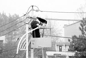 扶沟县供电有限责任公司为营造亮丽的夜间城市环境,积极对电网所辖路灯设施全面进行检修,更好地服务民众安全出行。图为11月3日,该公司路灯所人员在南二环路检修路灯。(刘滨 刘军胜 摄)